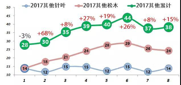 前8月累積進口輻射松80萬立方米,花旗松17萬立方米。8月分別進口12萬和2萬。